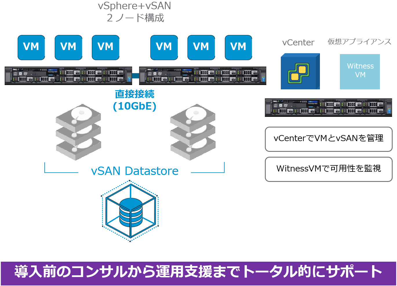 VMware vSANのシンプルな統合管理やシステム可能性・運用性のメリットをそのままに、2ノードだけのシンプルな構成したミニ・ハイパーコンバージド・インフラをベースに、日本コムシスでは導入前のコンサルから運用支援までトータルサポート致します。