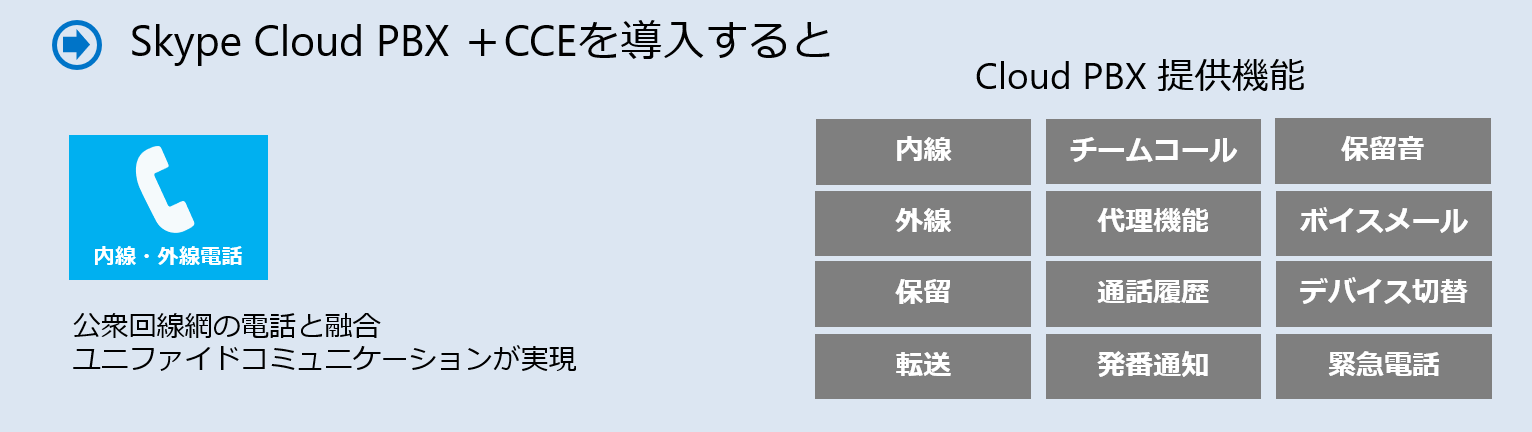 相手のプレゼンス(在籍状況)、インスタントメッセージ(IM)、音声/ビデオ会議、電話、ボイスメールなど状況に応じて様々なコミュニケーションが可能となります。更に Skype Cloud PBX システムを導入することにより、公衆回線網の電話と融合することができます。エンドユーザーは、ひとつのIDで全てのコミュニケーションツールを利用することが可能となり、新たな働き方のツールとして活用することができます。